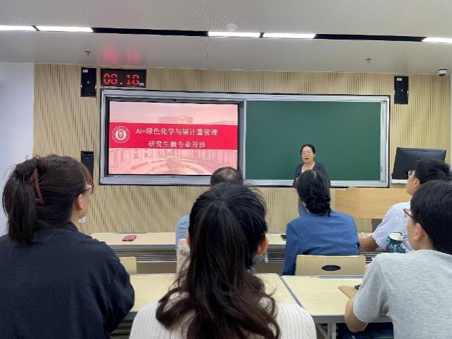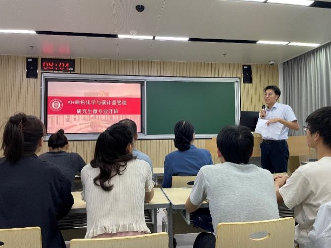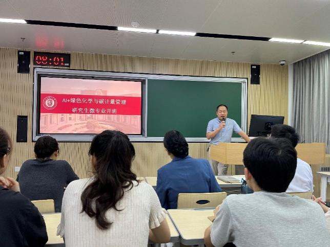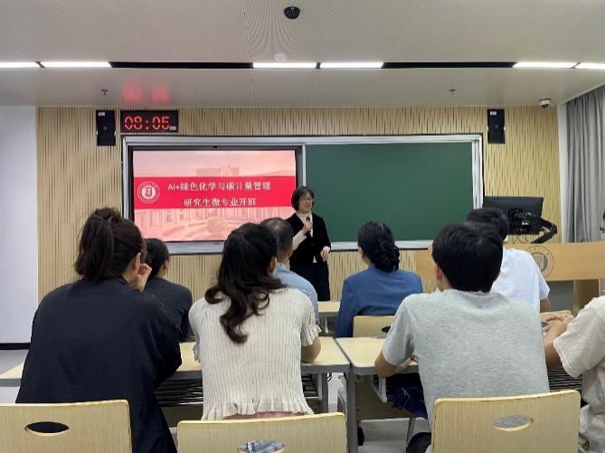 2025年10月18日,“AI+绿色化学与碳计量管理”研究生微专业在四教300举行了隆重的开班仪式,研究生院副院长郑继红教授、材料与化学学院副院长李伟教授、微专业联合办学企业单位上海化工环境监测站贾英高级工程师等领导出席,全体微专业班学生和任课教师出席了开班仪式。微专业负责人张淑平教授解读了课程和实践内容设置及相关要求。贾英发布了来自企业方的实践项目,并和程平老师分别主讲了《AI+智慧环境监测》和《人工智能与化学》开班第一天的课程。
