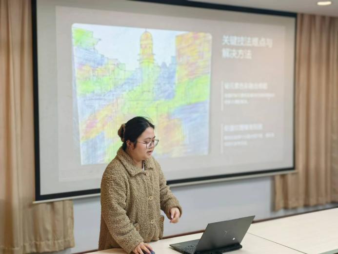 决赛现场,入围作品呈现了科学与艺术交融的多元面貌:绘画《喀什古城的一角》借铋晶体的阶梯状几何,叠映出古城建筑的东方韵律;摄影《纤毫之下》以纳米纺丝为幕、水滴为笔,在材料表面勾勒出若隐若现的校园印记,演绎“隐匿与显现”的哲思;短视频《金相制备:领悟材料之美》则通过镜头语言,将纯铁从粗砺到镜面的制备过程,转化为微观晶粒世界的诗意显影。