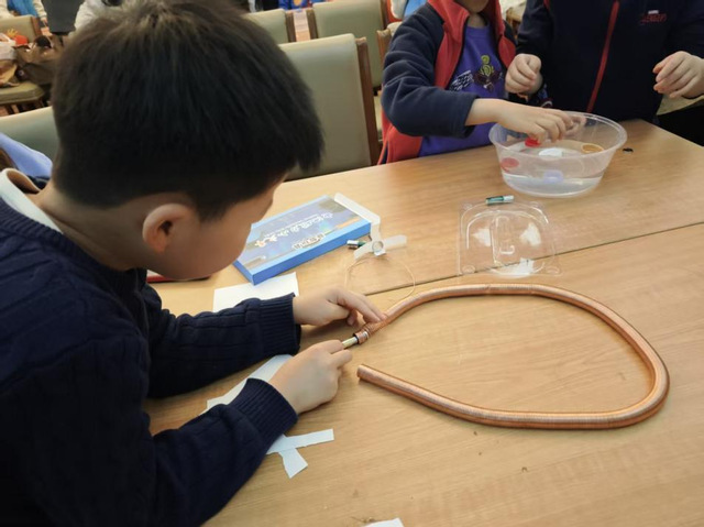 磁力小火车:这是最受孩子们欢迎的项目。一枚吸附着磁铁的电池放入螺旋线圈后,竟能自动“行驶”起来。志愿者们借此趣味现象,深入浅出地讲解了电磁感应与闭合回路原理,在孩子们心中悄然播下了科学的种子。